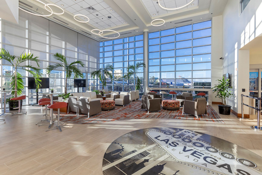 The complete interior renovation of the 7,786 sq. ft. facility includes modern pod-configuration customer service representative counters, a customer lobby and lounge area, new amenity bar, crew lounge, quiet rooms, restrooms, conference rooms, café, business center and management offices.