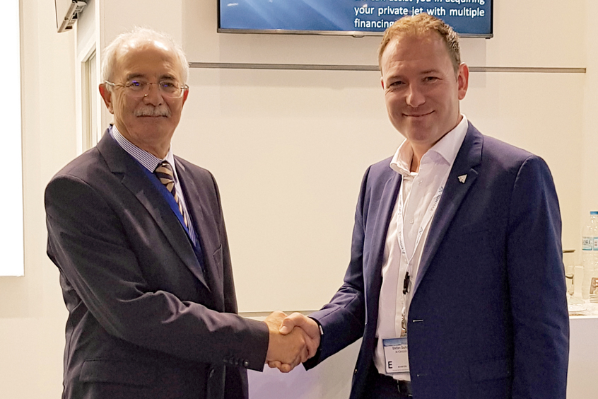 Alghanim Group has formed corporate aircraft financing company Jet Lease Finance in a joint venture with London's Avionmar. Headquartered at Shannon, Ireland, JLF will target clients seeking asset-based finance for at least eight million dollars. Shaking hands are Ramsey Shaban of Alghanim subsidiary GainJet and Avionmar MD Stefan Duller.