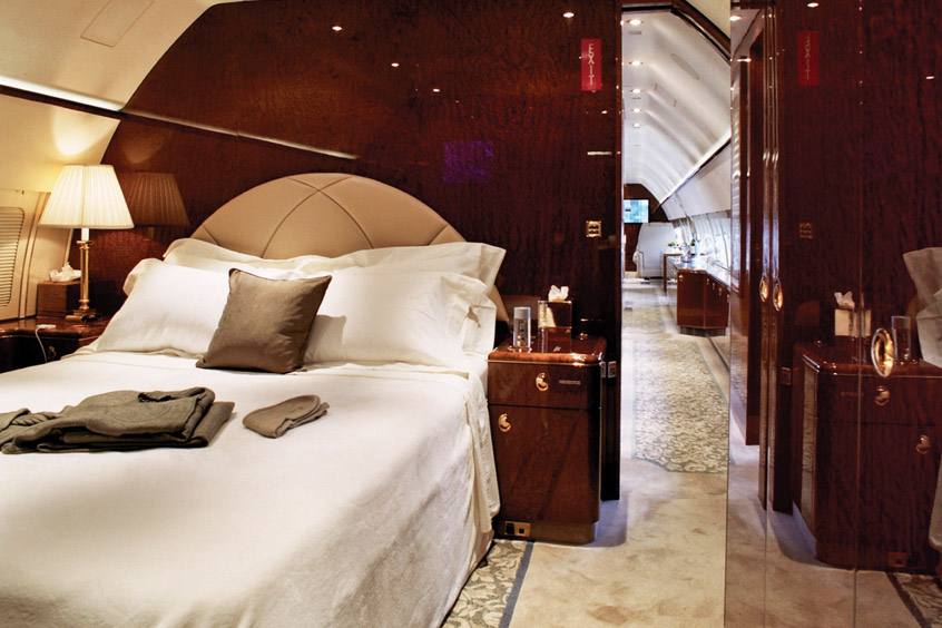 The privately-owned aircraft is configured to accommodate 18 passengers with regular business class seats supplemented by sectional L-shaped sofas creating two separate lounge environments. There is a fully equipped galley, including microwave and oven. The cabin also incorporates lie-flat sleeping for 11, including one state room featuring a queen-size double bed, shower and toilet.