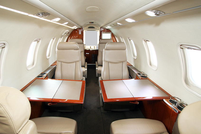 The interior features new leather seats, a forward refreshment centre and pull-down window shades for cabin privacy. A fully-enclosed lavatory equipped with a belted leather seat and sink is located in the aft cabin. It also houses an external baggage compartment for luggage.