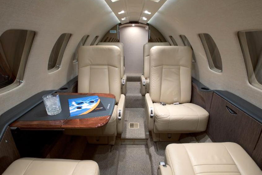 The Bravo is configured for nine passengers with sandstone leather seating and a high-gloss cocoa maple cabinetry interior with dual executive tables, newly-installed in 2015. The aircraft also has a fully enclosed aft lavatory and special ski tube equipment storage.