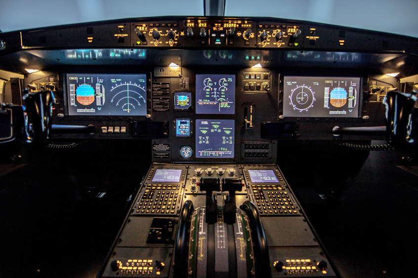 FlyBySchool is the launch customer of entrol's en-4000, which features SEP, MEP and jet configurations. The simulator's SEP and MEP configurations are equipped with dual GTN 650 for PBN and LPV courses, and can be switched between glass and analogue cockpits. The jet configuration is very close to an A320. It has dual MCDU, overhead complex, ECAM, throttle quadrant with trim wheels and optional sidesticks.