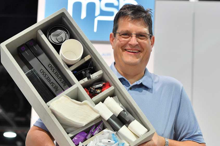 Supporting a commitment to optimise space and to keep loose items that clutter surfaces contained, MSB has also developed a 'clutter-cube' that incorporates customisable magnetic dividers that can be configured to stow anything from connection cables, bathroom amenities, individual galley items or any miscellaneous objects in one neat container. They can also be configured to be easily swapped in and out for operators tailoring to regular passengers' specific onboard requests. The strong honeycomb structure of the unit can be sized as needed to fit galleys, storage or luggage compartments, and be finished to emulate cabin design, personal preference or company branding. It will replace unsightly transparent plastic boxes or plastic bags often used for storing sundry items, and reduces noise by preventing miscellaneous items rattling.