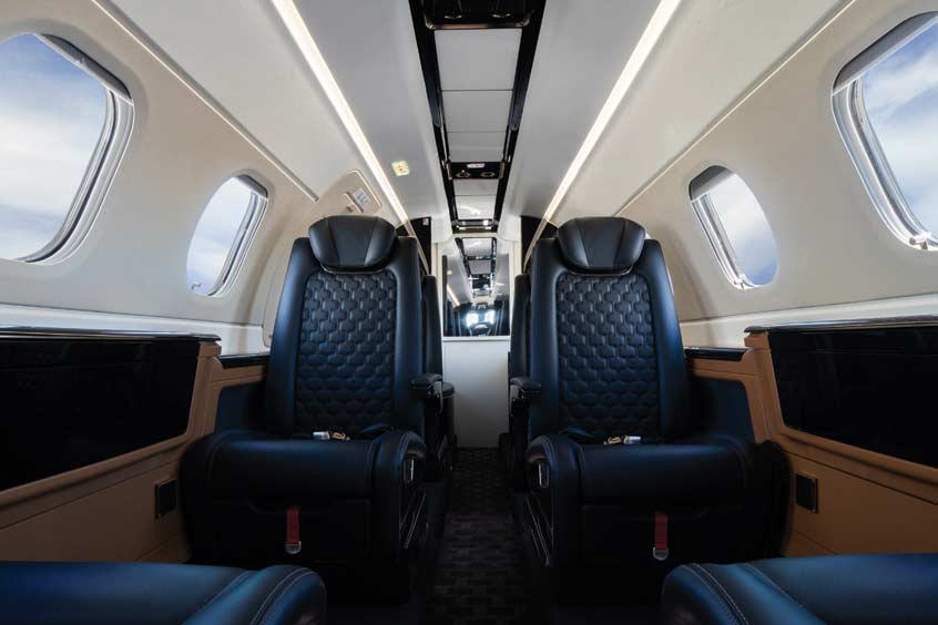 Passengers can enjoy the best cabin altitude in the category (6,600 ft at FL450) along with a generously sized baggage compartment. Along with Embraer's iconic airstair and oversized windows, the 17-ft-2-in-long Oval Lite cabin features new enhancements that reduce cabin noise, plus the already significant head room and aisle space for truly exceptional in-flight comfort. First created for the Praetor 600, the optional Bossa Nova edition interior, which won best interior design at the 2019 International Yacht & Aviation Awards, is now available in the Phenom 300E. The forward-thinking cabin design also includes adjustable lighting, touchscreen monitors and patented flush gaspers. Multiple zones of personalisation and the nice HD by Lufthansa Technik, an advanced cabin control system that offers portable device integration and wireless audio/video streaming, further add to the sophisticated interior. The highly-convenient features that the jet carries down from a segment above include single-point refuelling, an externally serviced lavatory and an airstair.