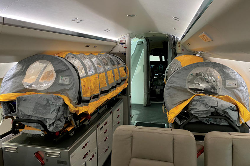 Rega chief physician Dr. Roland Albrecht, under whose leadership the PIU was developed, explains: “Before being invited onto the ambulance jet, the patient is isolated in a kind of protective tent according to a strict procedure, which prevents the risk of infection of the jet crew during the flight." Another advantage is that the jet does not have to be cleaned and disinfected afterwards, but is immediately available for a new use.