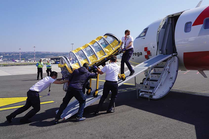 When repatriating patients, the patient isolation unit (PIU) developed by Rega with its partners in 2015 is used in most cases, enabling the transportation of patients with contagious diseases in the ambulance jet. The Ebola epidemic, which broke out in several West African countries in December 2013, made it clear that there had hardly been a safe and reliable transport concept for highly infectious patients. In collaboration with various partners, Rega therefore developed a patient isolation unit (PIU) for airborne transport in 2015 and developed a corresponding concept. The isolation unit and the corresponding transport concept allow Rega to repatriate or transport patients with known or unclear infectious diseases with minimal personnel expenditure in their own ambulance jets relatively easily and yet safely. Before the corona pandemic, the PIU was used, among other things, in a suspected Ebola case and in patients with highly contagious open tuberculosis.