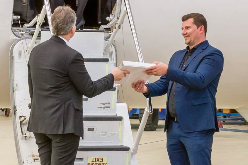The comprehensive maintenance work included a full cabin refurbishment using the latest materials and painting work. In addition, an extended upgrade of the Collins Pro Line 21 avionics system was implemented. This includes the installation of ADS-B. This air traffic control system for displaying aircraft movements in airspace has been mandatory in the USA and the UAE since 1 January 2020. This system enables the aircraft's route to be tracked, as it determines its exact flight position via satellite navigation and periodically broadcasts it. The upgrade also includes the implementation of the take-off safety enhancement (TOSE) system.