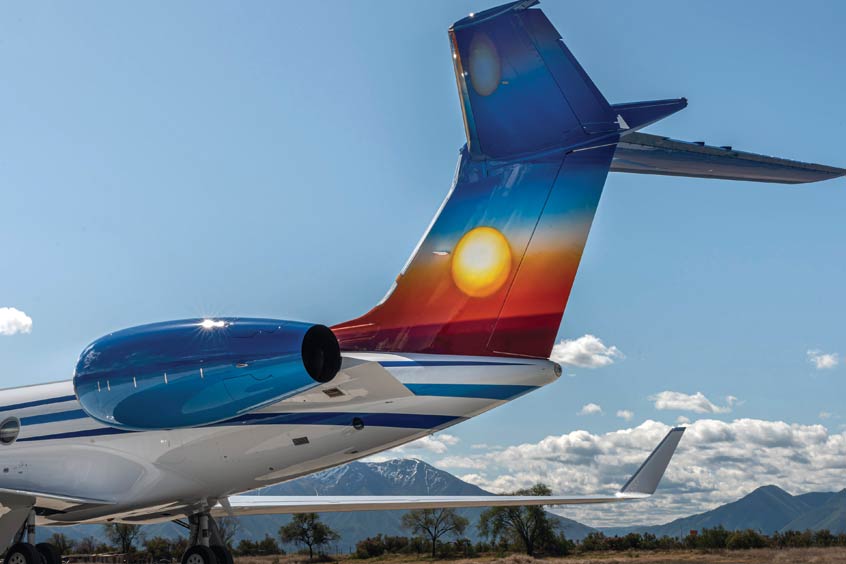 “The existing scheme had a dated design featuring a palm tree that gave it a Miami Vice look,” Foster explains. “The new design now has a light-to-dark blue fade on the nose and engines, and the tail features a hand-painted sunset. I cannot give our paint team here in Provo enough credit for how perfectly that intricate design turned out.”