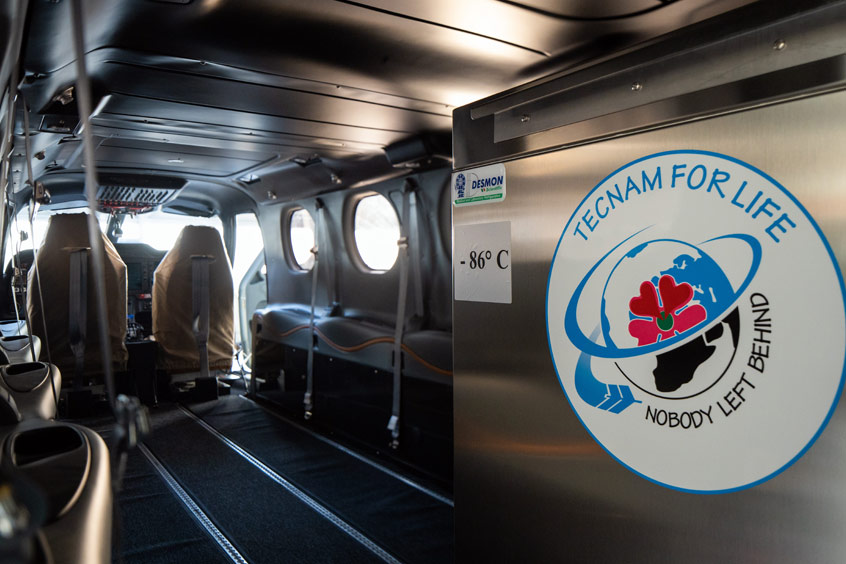 Equipped with Desmon's ultra-freezer designed to attain, maintain and track product temperature, Tecnam's P2012 TravelCare can transport as many as 115,000 doses to areas with less than 1,850ft of paved or unpaved runway.