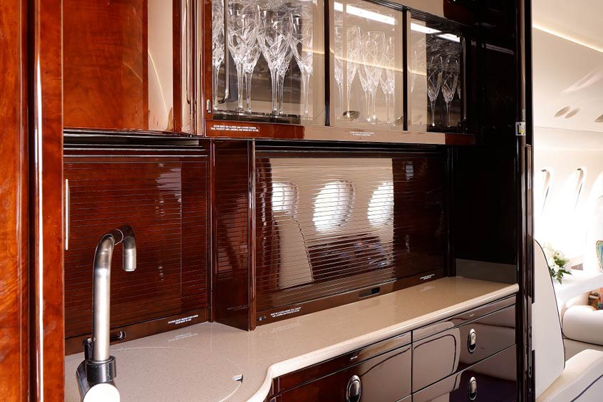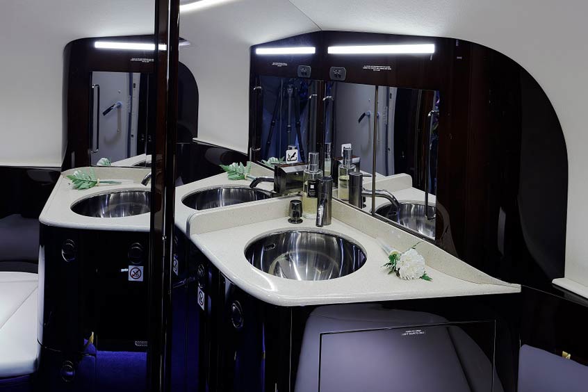 RAS says thata successful interior project lives on long after an airframe has left the shop. Because of this, careful examination and detailed testing of all materials were required to ensure their longevity and resilience. Specialised tests were performed on all materials to understand how they might react to long term exposure to sunlight, moisture and pressurisation. After several rounds of testing, RAS Interiors' in-house design department, together with the company's manufacturing division, crafted stylish products that could withstand unfavourable conditions, while at the same time presenting a pleasant visual appeal and the practicality of structural integrity.