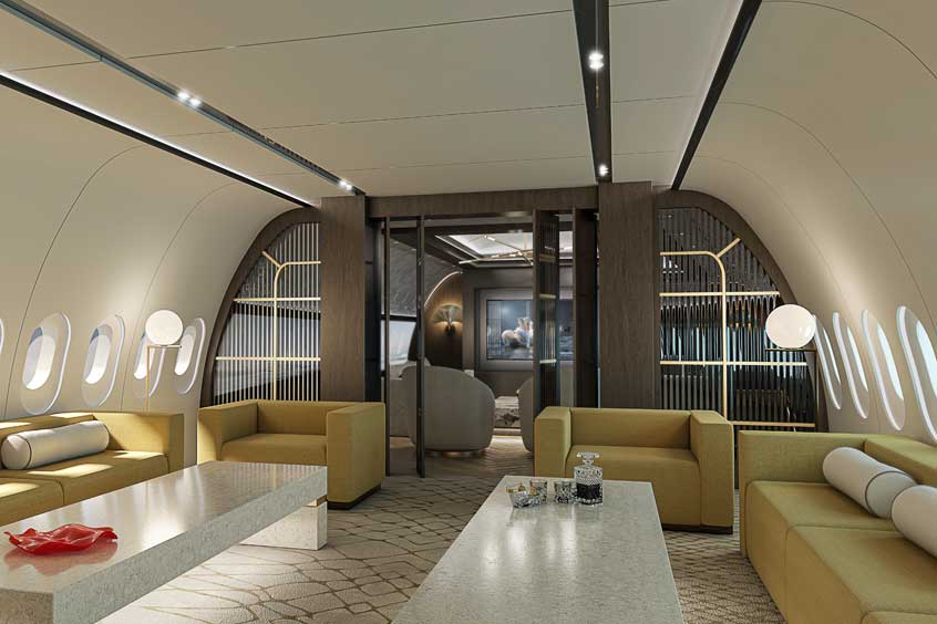 Greenpoint's Ascend interior features an expansive, interactive main cabin with advanced technology concealed within bespoke cabinetry. Greenpoint programmed the interior with a variety of progressive, intuitive technologies able to respond to requests through voice and gesture controls. Key design features include transparent OLED displays expanding across the windows and celestial-inspired valance panels designed to illuminate as passengers move throughout the cabin. Handcrafted bi-fold glass doors connect two lounges, displaying a warm, neutral colour palette, elegant architecture and minimalist details.