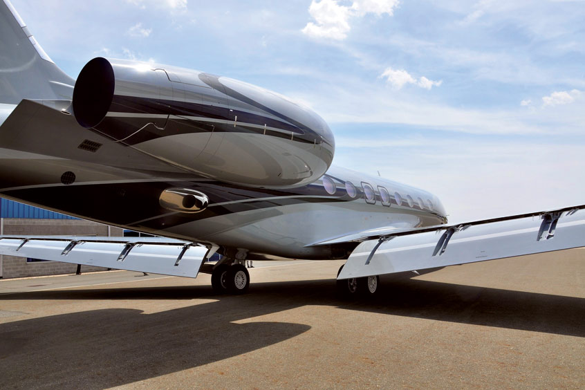 On completion, the G650 fuselage boasted a sparkling pearl/mica Diamond Mine base coat surface combined with an intricate design incorporating curving stripes and complicated swirling patterns. To achieve the striking results a specialty bisect-clearcoat polyurethane paint incorporating translucent pearl and mica granules that generate a crystal-sparkling effect was applied after the priming process. A metallic colour pallet featuring concord blue, dusk grey and medium silver colours was subsequently used to complete the scheme. The need for mirror-images to appear on the right- and left-hand sides of the aircraft, along with incredibly detailed specifications about distances between stripes, colours and patterns added to the complexity. The design is so intricate that even when viewed from above, the pattern is precise. The multi-faceted process required technical expertise and intense attention to detail to achieve a fuselage that will be noticed on any ramp.