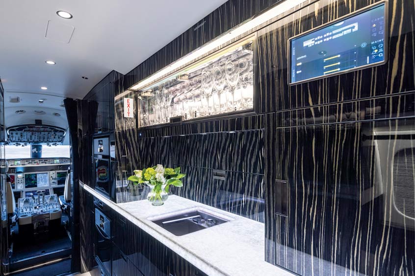 The first two installations of the F/List Syntec flooring system were outfitted in the entryway areas of two production Pilatus PC-24 Super Versatile Jets earlier in 2021, while the first refurbishment using Syntec flooring has been completed on a Bombardier Global. The striking lighting effect is already realised in a Boeing Business Jet where a fully illuminated bar counter made of real tinstone brings an extra dimension, as well as beauty, to the executive airliner's cabin interior. A completed Bombardier Global 7500 has the lighting installed under the galley counter to add a truly stunning design concept to the cabin.