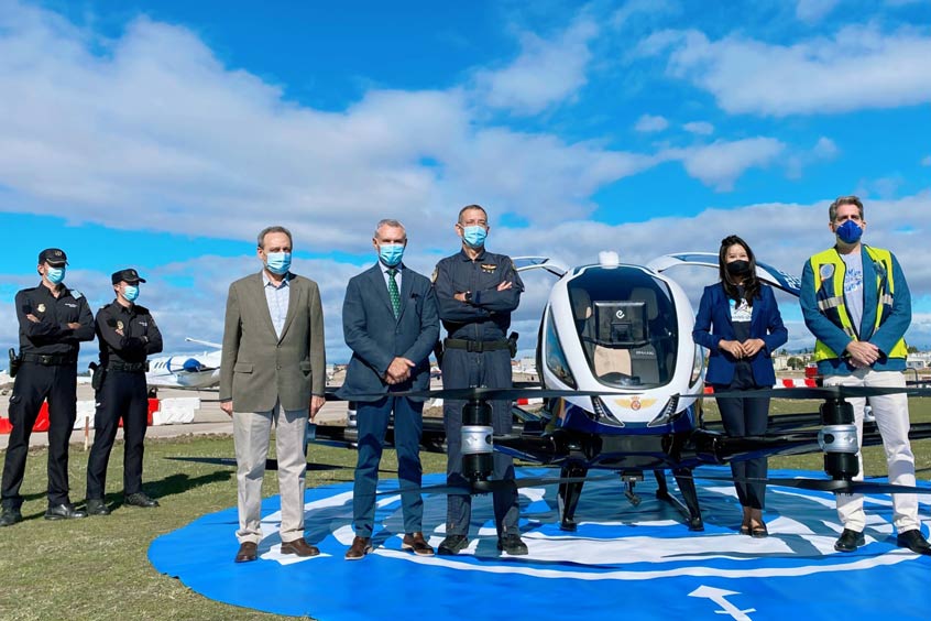 EHang Holdings Limited is collaborating with the Spanish national police to explore potential use cases for autonomous aerial vehicles in emergency and security missions. At the press day of Expodronica at the World Air Traffic Management Congress, EHang made the first public exhibition of the EHang 216 passenger grade AAV at the Cuatro Vientos Aerodrome in Madrid, Spain.