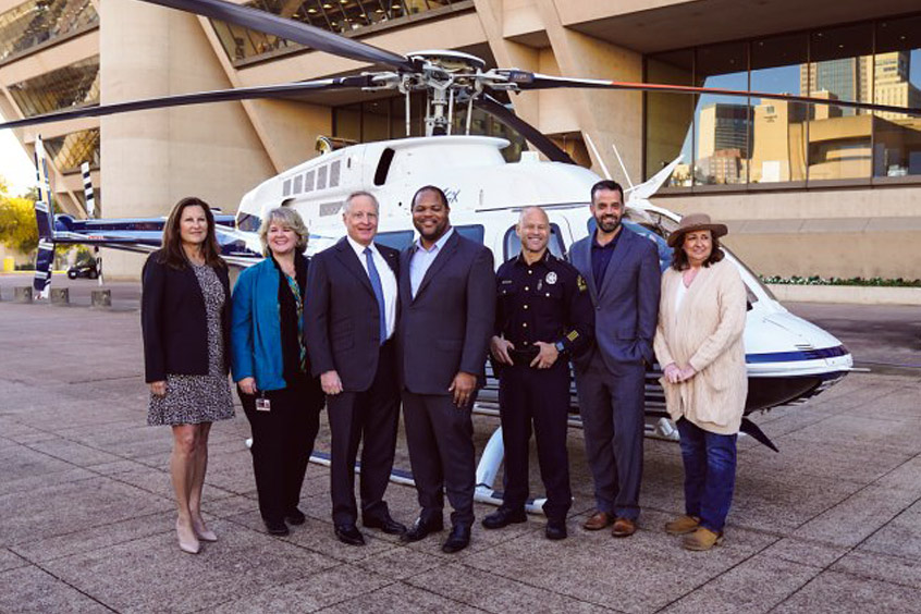 The donation was celebrated by landing the helicopter in front of City Hall, and was presented to mayor Eric Johnson and chief of police Eddie Garcia.