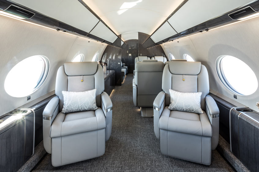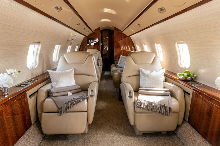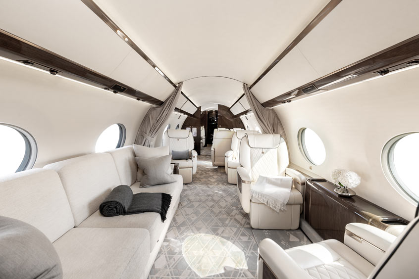 A 15 seat Gulfstream 650 with a range of 7,000 nm will carry passengers non-stop from Los Angeles to London. It has a low cabin altitude and non-recirculated cabin air. A two seat club is placed opposite a three seat divan in the forward cabin and two seats face the galley. In the mid-cabin there is a four place dining area opposite a credenza, and in the aft cabin a three seat divan opposite a single seat.