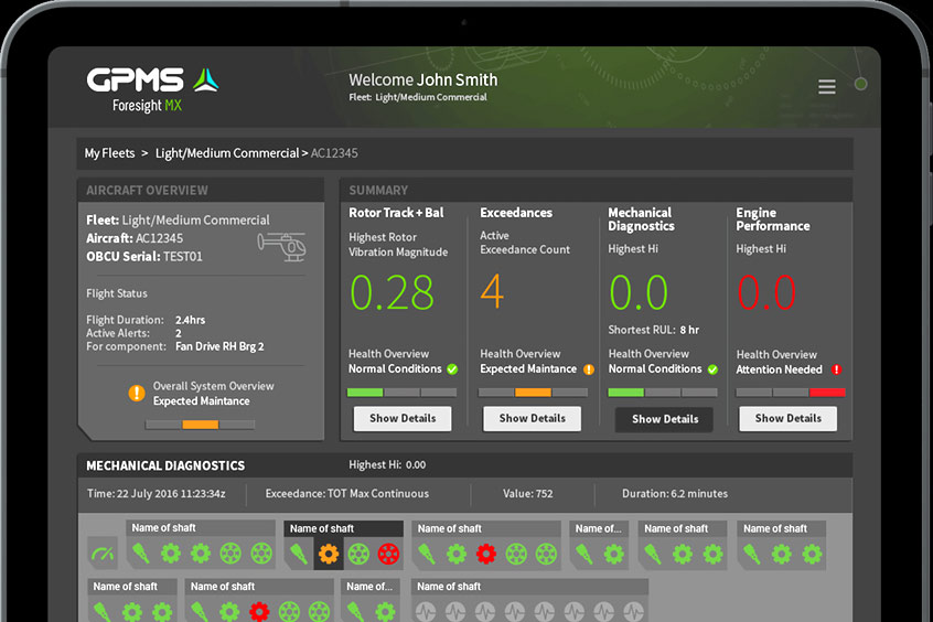 GPMS has developed proprietary technology that is key to effectively detecting faults on complex machines. Its product, Foresight MX, integrates this technology into a comprehensive health and performance monitoring system that provides predictive analytics needed to ensure the safety, asset reliability and maintenance efficiency of aircraft, as well as other vehicles and industrial machines.