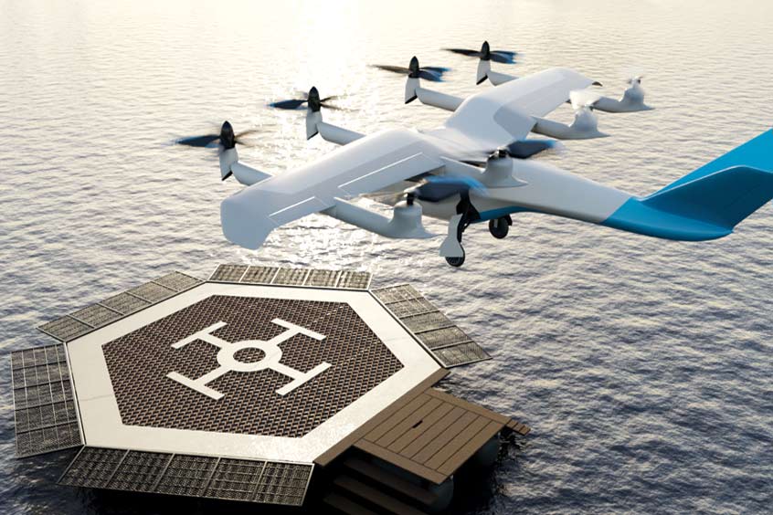 To overcome the red tape and difficulties involved in establishing vertiport operations from a land-based site, FlyOnE has developed a floating pontoon-based landing pad charge node capable of receiving all eVTOL aircraft currently in development. One is to be sited at the Royal Aero Club of Western Australia. It has onboard stored power capable of charging the Air One multiple times and can anchor and manoeuvre autonomously or by manual control. This allows it to receive a landing eVTOL the required minimum distance of 500m from a building and then, under its own electric power, manoeuvre into a dock, jetty or alongside a water vessel to allow passengers to disembark, all the while recharging the aircraft. The aircraft can also be recharged while docked from available grid energy.
