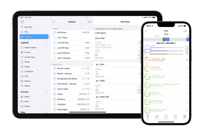 LogTen's new navigation system on iPhone and iPad will make logging flights more efficient than ever before. 'New Entry' enables pilots to instantly log a new flight or duty with a single tap, no matter where they are in LogTen. The popular 'Plan' and 'Analyse' tabs are quicker and easier to access with dedicated tabs app-wide. And all logbook related items like Aircraft, Types, Places etc as well as Reports and Backup functionality have moved from Settings to directly in the Logbook tab.