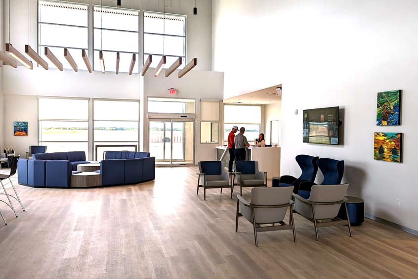 The multimillion-dollar facility, the first of three planned construction phases, is located east of NTRA's 9,000 ft main runway (17L-35R) mid-field and adjacent to 25 acres of concrete ramp space. The new FBO terminal welcomes the flying public to a comfortable and spacious passenger lobby with multiple seating zones and the latest amenities.