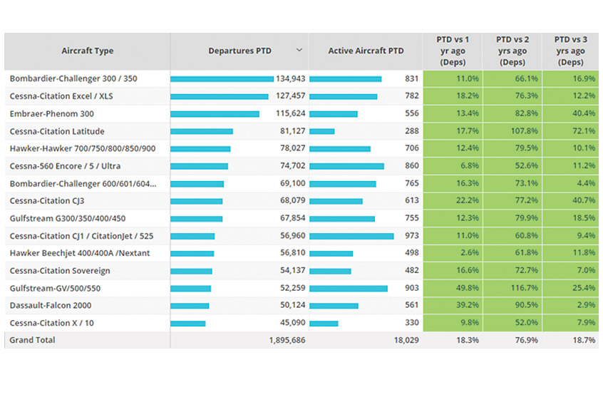 For the year so far, the overall region of North America has notched up record flight activity, with almost two million business jet sectors flown, up 18 per cent on last year, which by August 2021 had caught up with 2019. The US has a 23 per cent gain on the comparable year to date 2019, with both Canada and Mexico still trailing pre-pandemic activity. Destinations like Puerto Rico, Costa Rica and US Virgin Islands have at least 30 per cent gains on the pre-pandemic January-August 2019 period. Most of the Caribbean has seen record flight activity, with exceptions in Cayman, Bermuda and Barbados. Across the whole region, the Challenger 300/350 is the busiest jet this year, 17 per cent busier than pre-Covid. The Phenom and Latitude have seen the largest increases in fleet activity. The long-standing GV/500/550 fleet is flying 25 per cent more than in 2019.