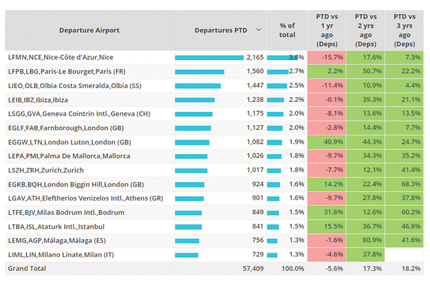 Across Europe, business jet departures so far this month are six per cent below August last year and 18 per cent ahead of August three years ago. In week 34, ending on 28th August, flight activity was seven per cent below the same week in 2019, with the AOC market, covering charter operations, slumping 10 per cent year on year, which is slightly worse than the eight per cent downward trend in the last four weeks. Most of the leading business aviation airports in Europe are seeing a slowdown versus the exceptional August activity last year, with Nice, Olbia and Majorca significantly less busy. There were exceptions, notably London Luton with a 40 per cent YOY increase, which takes it up 24 per cent on the comparable 2019 period, and London Biggin Hill, whose activity is up another 14 per cent on August last year, stretching the gains versus 2019 to 68 per cent this month.