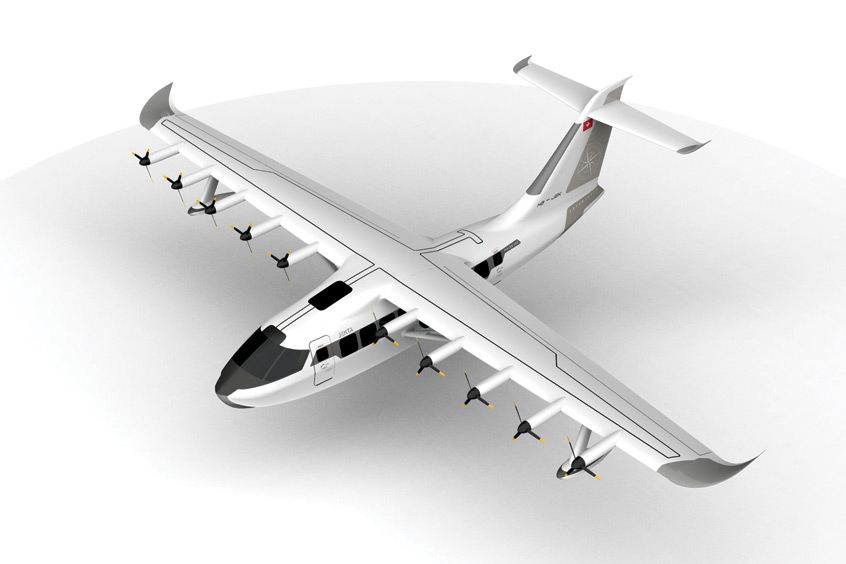 PHA-ZE 100 (Passenger Hydro Aircraft Zero Emissions) is a 19 seat passenger amphibious seaplane made of composite materials. The aircraft has a high-wing layout where 10 electric motors and batteries are located. The large volume displacement body can be configured in business, passenger, cargo and ambulance configurations. It is able to cover 150 km at a cruising speed of 135 knots, take off in a wave height of 1.2 m, while stall speed in the landing configuration will not exceed 50 knots. The batteries can be quickly changed or recharged within 45 minutes. The aircraft will also be able to be retrofitted with fuel cells once the technology becomes available.