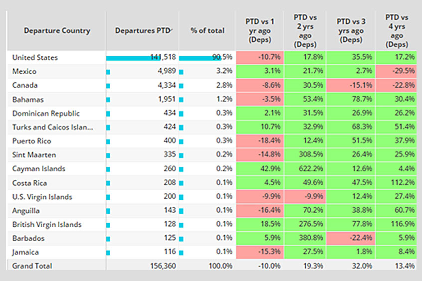 Focussing on US business jet activity in March, sectors are 11 per cent behind a comparable last year, but still 19 per cent ahead of 2019. 93 per cent of flights have been domestic this month and just seven per cent international. Domestic flights are down 12 per cent compared to last year, but are still 19 per cent ahead of 2019. International flights are on par with last year and 21 per cent ahead of 2019. Mexico is the top international destination this month, with flights down eight per cent compared to last March, although 28 per cent ahead of 2019. Flights to Canada are still behind pre-pandemic 2019 by 14 per cent, but rebounding three per cent ahead of last year.