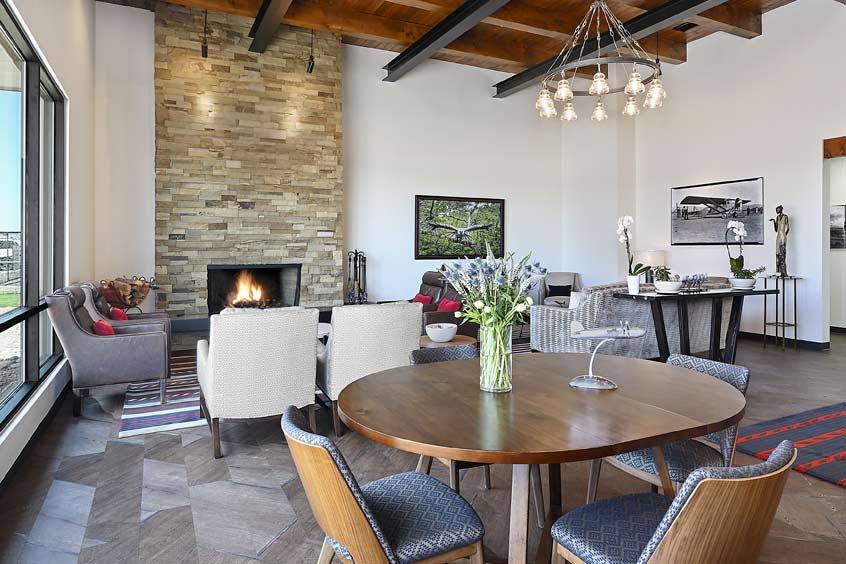 The new, 6,200 sq ft customer terminal features a modern, luxurious southwest aesthetic with 18 ft ceilings beautifully appointed with natural wood and metal beams, complemented by an eye-catching chandelier. Its lobby lets in the light with a large, 10 panel window that overlooks the ramp and offers magnificent views of the Jemez Mountains, and offers a floor-to-ceiling stone fireplace with seating area.