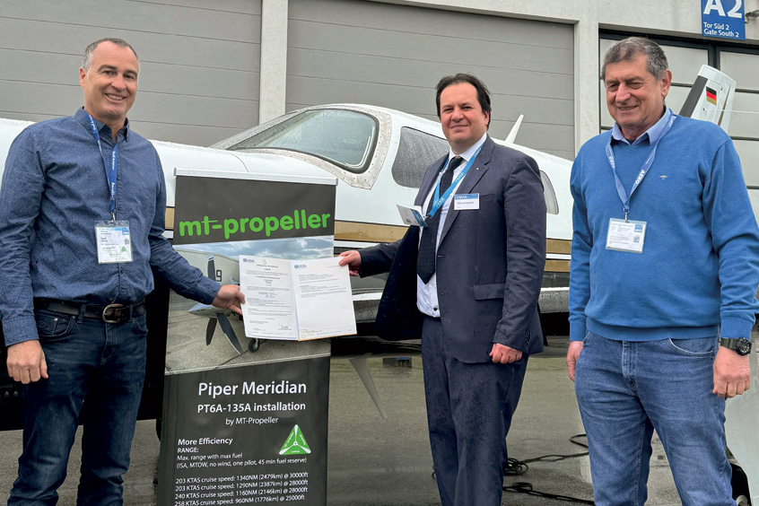 The MT-Propeller EASA STC for the installation of the PT6A-135A engine in the Piper Meridian was handed over by Marco Capaccio, small aircraft, balloons and airships section manager, EASA to Josef Eberl, MT-Propeller chief engineer and test pilot and Martin Albrecht, MT-Propeller general manager and test pilot at AERO Friedrichshafen.