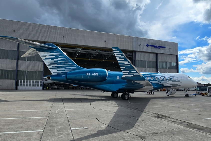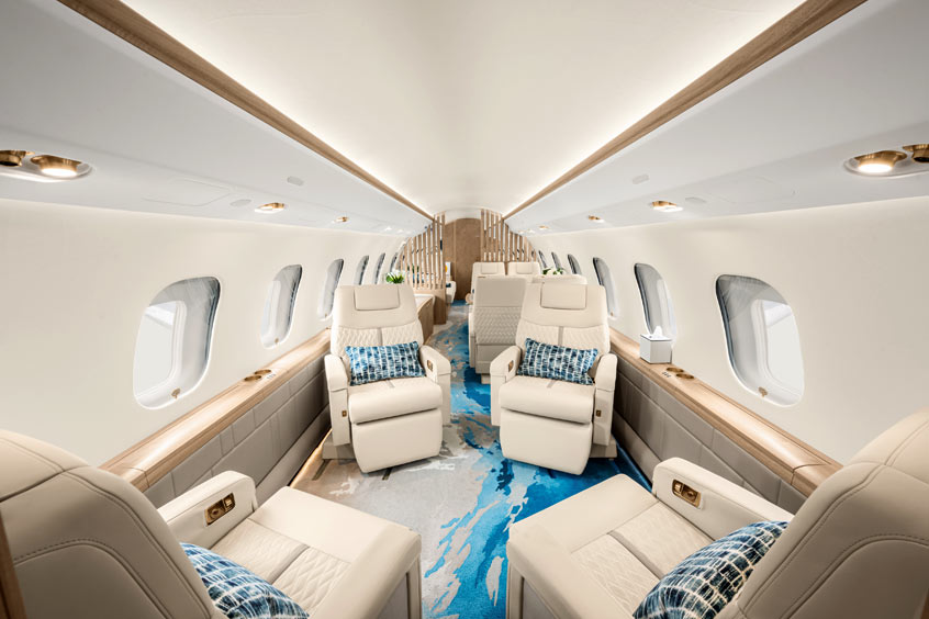 A newly painted, teal blue and white Bombardier Global 6000 flew in to EBACE 2024, showcasing a stylish new interior from leading British yacht designer Winch Design.