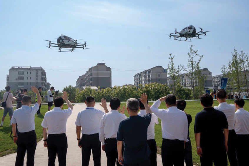 Two EH216-S aircraft took off simultaneously with four passengers on board for an aerial view of the vast paddy fields. The flights showcased the potential of pilotless eVTOLs in providing aerial sightseeing services in Taiyuan and demonstrated the advantages of the EH216-S in autonomous flying, cluster management, and safe and stable operations, earning both acknowledgement and praise from the guests and passengers.