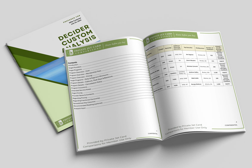 The Decider Custom Analysis report delivers the comparisons in a multi-page PDF presentation with an overview of relevant providers, including company ownership, aircraft sourcing model, when they were founded and company size. It compares the programmes, precisely fitting the subscriber's needs, including what type of pricing is offered, aircraft categories, specific aircraft types, minimum seat guarantees, purchase price, expiration of funds, rate lock duration, refund policies, membership fees, hourly rates, peak day surcharges, roundtrip discounts, daily and segment minimums, taxi time charges, peak and non-peak booking windows, number of peak days and blackouts, cancellation deadlines and policies, inclusions such as ability to upgrade or downgrade aircraft size, guaranteed wi-fi, ability to bring pets, CO2 offsets and where you can fly at contracted rates.