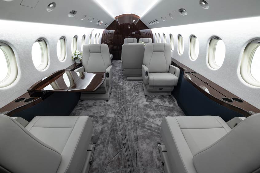 The clients liked the aesthetics of their other aircraft, a Falcon 7X, so senior lead designer Stephanie Kuhn assembled several materials and paint scheme options that reflected those preferences, while ensuring a unique identity tailored specifically for the Falcon 2000.
