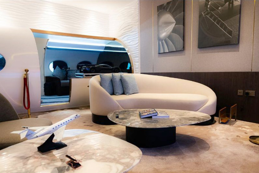 The showroom includes a private meeting room and a comfortable majlis area for guests to gain the information required to make informed decisions in a relaxed and luxurious environment. Aviation lovers can get up close to a mock-up fuselage of one of latest and fastest private jets on the market, which only entered service this year.