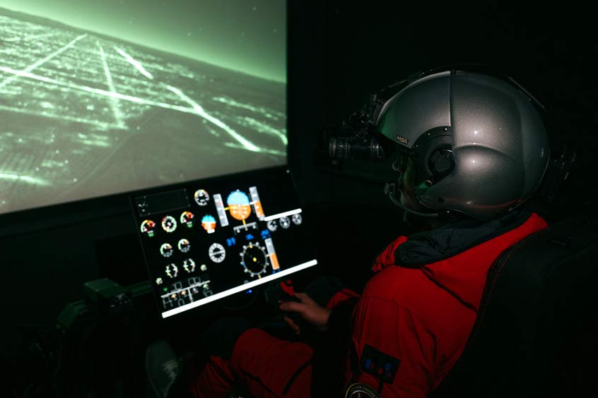 The syllabus contains almost two days of theory, where all relevant aspects to be considered in an NVG environment are presented and discussed in detail. Thereafter the pilot will receive a passive demo of the effects under realistic conditions using real NVG and the VTB. The next session is already a flight session using real NVG to experience the effects during aircraft operation. Finally, the pilot will receive three more pilot-in-the-loop sessions in the VR (virtual reality) environment to gain more experience with night operations.