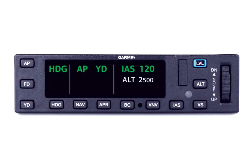 The GFC 600 digital autopilot is intended for piston single/twin-engine and turbine aircraft that have a wide range of speed and performance characteristics and provides a long list of existing general aviation aircraft with a simple, lightweight, cost-effective autopilot upgrade path. Incorporating solid state attitude with robust self-monitoring capabilities, the GFC 600 provides superior autopilot performance, greater reliability and tremendous safety tools. In addition to traditional autopilot capabilities such as altitude hold, vertical speed and heading modes, the GFC 600 also includes: premium functions and advanced capabilities such as altitude pre-select and indicated airspeed hold mode; VNAV can fly a fully coupled vertical descent profile with automatic step-down altitude captures; dedicated LVL button can automatically engage the autopilot to restore the aircraft to straight and level flight with one press; underspeed and overspeed protection; select, couple and fly various instrument approaches, including GPS, ILS, VOR, LOC and back course approaches when paired with a compatible Garmin GPS navigator; yaw damping (YD) mode minimises yawing oscillations while also helping to maintain coordinated flight; Electronic Stability and Protection (ESP) functions independently of the autopilot and works in the background while the pilot is hand-flying the aircraft to help avoid inadvertent flight attitudes or bank angles by nudging the pilot to return the aircraft back to an appropriate flight attitude; and a mode controller with a colour LCD screen that presents mode annunciations in a format similar to Garmin TXi flight displays for easy reference by the pilot.