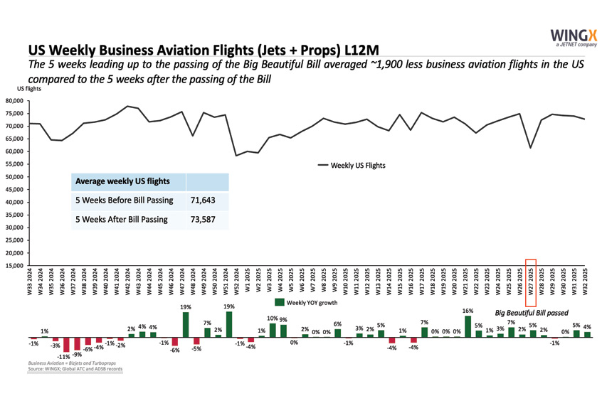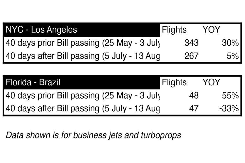 WingX data has shown no discernible impact on US business aviation activity since the Bill was passed on 4 July, just relatively normal seasonal activity trends, although US activity is actually up two per cent year on year. Its charts, pictured HERE, show flight numbers between New York to Los Angeles, and from Florida to Brazil, on the 40 days before and after the signing along with the year on year difference. In the five weeks prior, there were around 1,900 fewer business aviation flights in the US compared to the five weeks after.