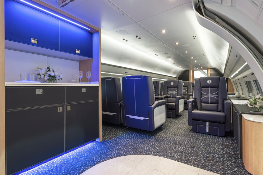 Finally, the staff cabin is configured with business-class seating; enhanced galley, lavatory, media features monitors and tables.