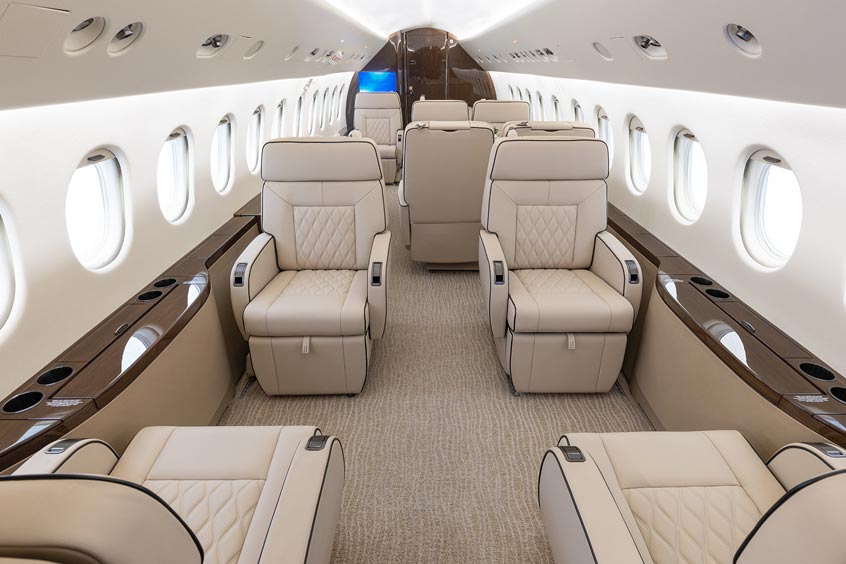 “The Gulfstream featured bold diamond quilting on the seats and sharp contrasts,” says Kuhn. “For the Falcon, the owner wanted a softer, more harmonious feel.”