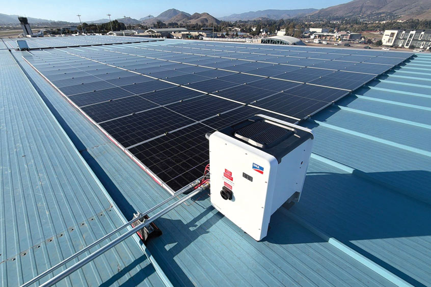 The installation was designed and delivered by SLO Craft Inc. and spans the rooftops of ACI Jet’s aircraft maintenance and storage hangars.